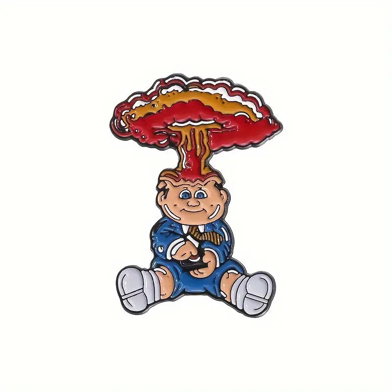 Introducing the Adam Bomb pin badge from Garbage Pail Kids! This quirky accessory features a small, bald boy in a blue coat, tie, and boots pressing a detonator. The mushroom cloud bursting from his head is a playful (and pun-ny) take on the atomic bomb. Perfect for those who don't take themselves too seriously!