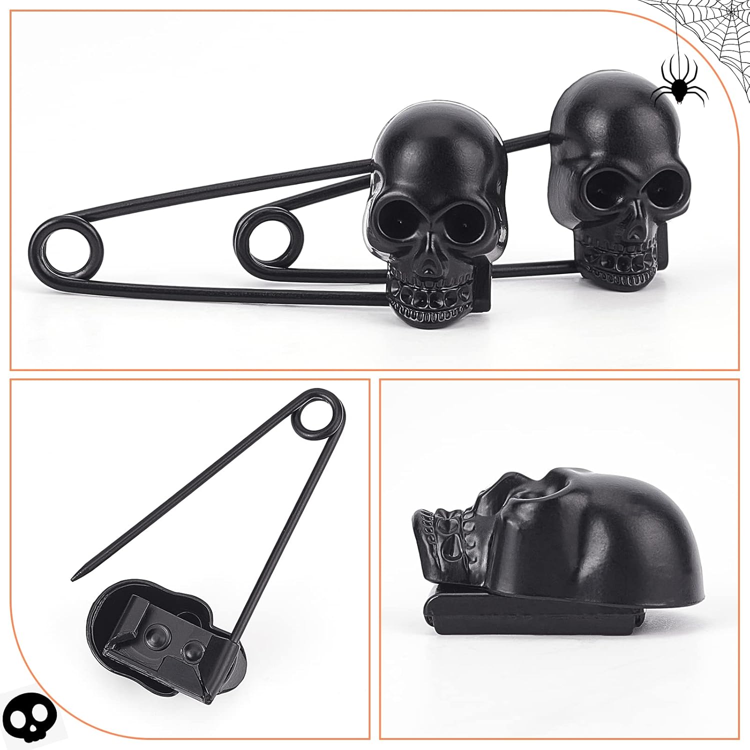 Edgy and bold, this black skull safety pin brooch brings gothic flair to any outfit. Featuring a striking skull design with intricate detailing, it fastens securely with a classic safety pin mechanism. Perfect for jackets, bags, or layered clothing, this statement piece adds an alternative edge to your everyday style. A must-have accessory for goth and punk enthusiasts.